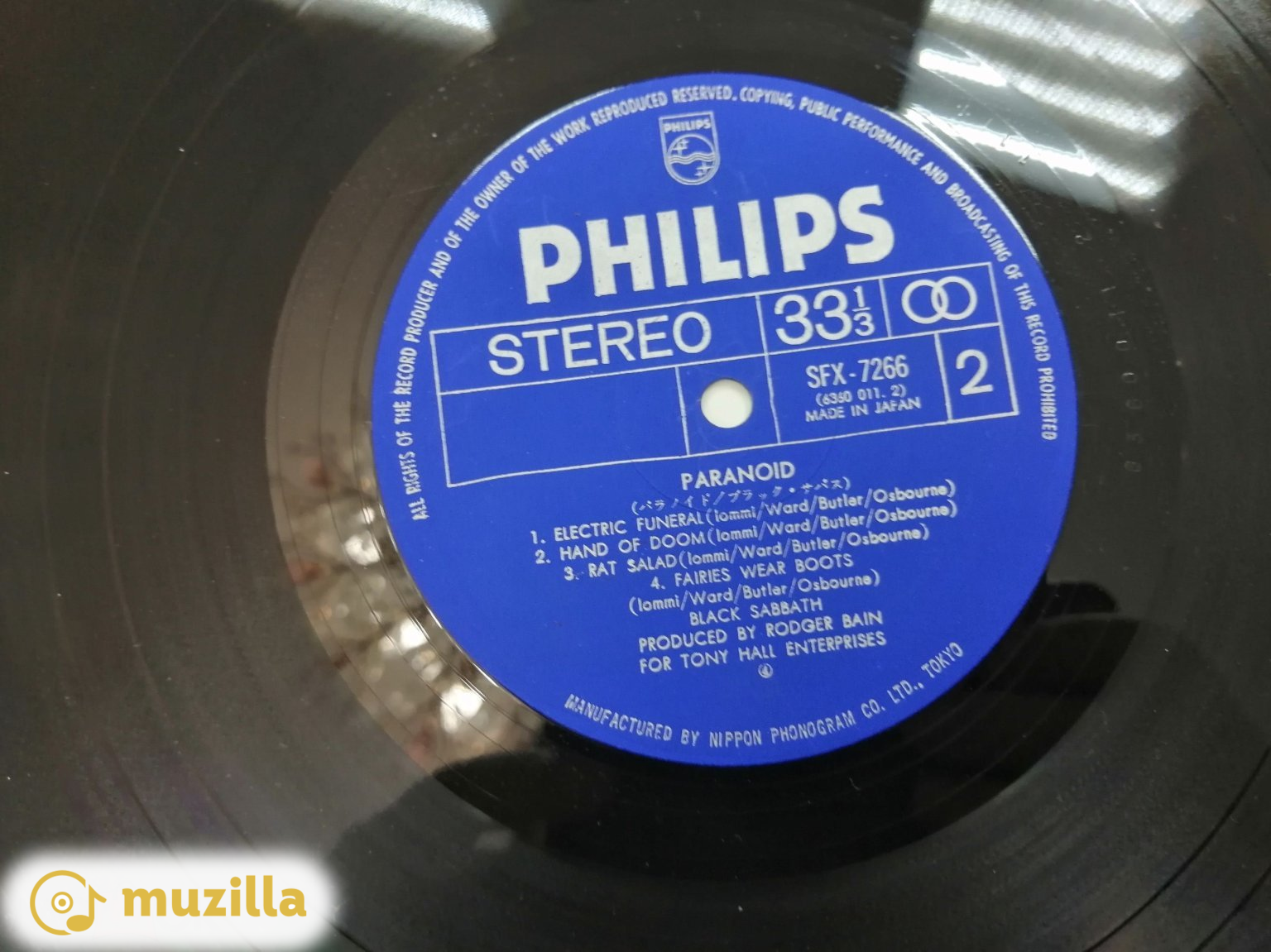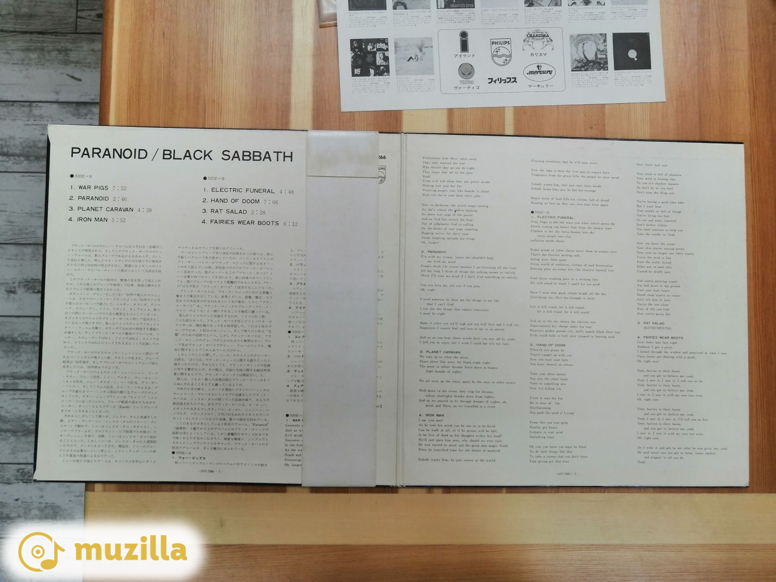Black Sabbath – Paranoid Black Sabbath - Paranoid album cover More images Label: Philips – SFX-7266, Vertigo – 6360 011 Format: Vinyl, LP, Album, Gatefold Country: Japan Released: 1970 Genre: Rock Style: Hard Rock, Heavy Metal A1 War Pigs A2 Paranoid A3 Planet Caravan A4 Iron Man B1 Electric Funeral B2 Hand Of Doom B3 Rat Salad B4 Fairies Wear Boots Manufactured By – Nippon Phonogram Co., Ltd. Produced For – Tony Hall Enterprises Producer – Rodger Bain Written-By – Ward*, Osbourne*, Butler*, Iommi* Japan initial first release. Comes with an obi strip with ¥1,950 printed on it as well as on the back of the jacket. The record company, Nippon Phonogram Co. Ltd., Tokyo, credits Philips as the label for it features the generic blue label on the vinyl & reads SFX-7266 (6360 011.1) Made in Japan. Like the original UK version this also comes in a gatefold sleeve, however instead of the tracklist/credits being printed over a group photo background, the Japanese release features a white background with the track list and durations in English, liner notes in Japanese by Tsuneo O' Mori along with the English lyrics(obviously transcribed by ear due to many mistakes) and a "Do It Rock" advertisement insert sheet with monochrome photos of album covers from other artists sold by Nippon Phonogram. There is a Vertigo symbol on the obi as an homage/respect, this is not the "label" Nippon Phonogram was necessarily distributing The record itself is black translucent when looking with a strong light source. Other (Price): ¥1,950 Matrix / Runout (Runout side 1 variant 1): Ⓗ 6360011 1 121⊹⊹ TAB Matrix / Runout (Runout side 2 variant 1): 6360011 2 111⊹⊹ Matrix / Runout (Runout, side A, variant 2): Ⓗ 6360011 1 121⊹ UK Matrix / Runout (Runout, side B, variant 2): 6360011 2 111⊹