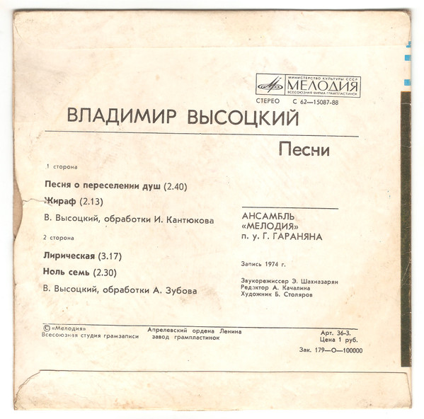 Владимир Высоцкий - 1980 "Песня о переселении душ" - 7" сингл