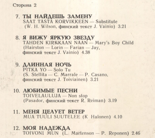 | B4 | Любимые Песни = Toivelauluja (Non Stop) Translated By – Raul Reiman