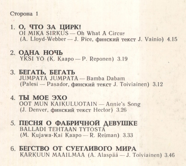 | B3 | Длинная Ночь = Pitkä Yö (Solo Tu) Translated By – Jorma Toiviainen