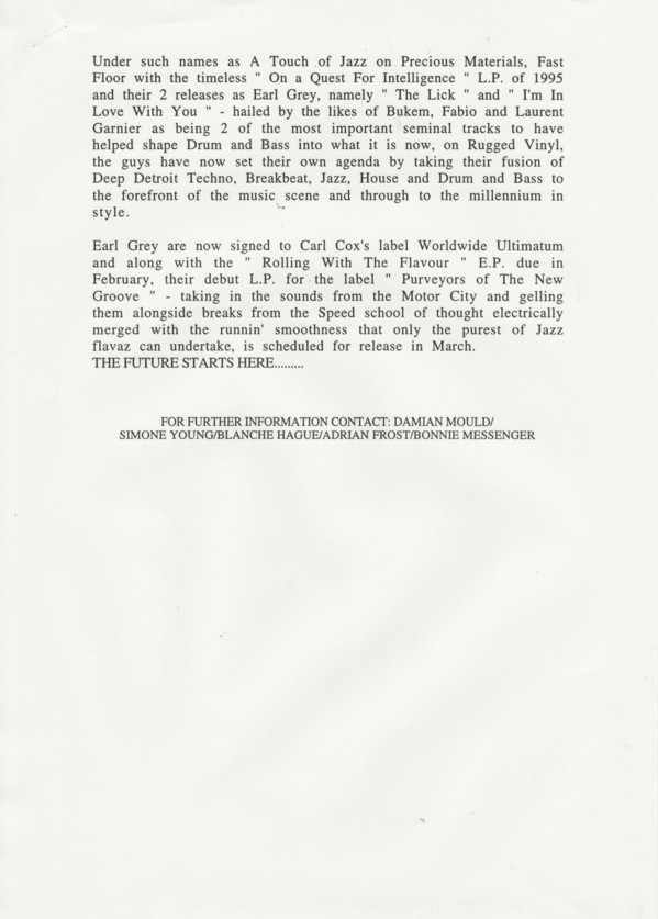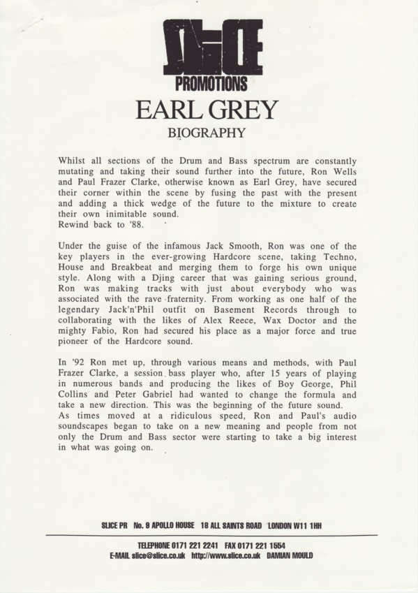 Earl Grey is a Jazz Drum and Bass collaboration between Ron Wells, a.k.a Jack Smooth, and Paul Clarke. They also recorded as Fast Floor.