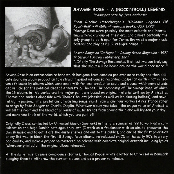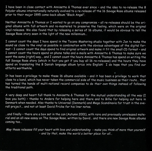 In 1999 Universal Music A/S hired Jens Andersen to work as a free-lance consultant on the huge Danish catalog they own. He made it a priority to make a proper re-release of the first 8 Savage Rose albums, first released on CD in the early 90's in a very bad quality. At the same time, by pure coincidence, Thomas Koppel wrote a letter to Universal pleading them to withdraw those CD's and do a proper re-release. Andersen, in close collaboration with Koppel and Annisette, then decided to extend the project to the 16 albums released prior to their major international 1995 comeback album .