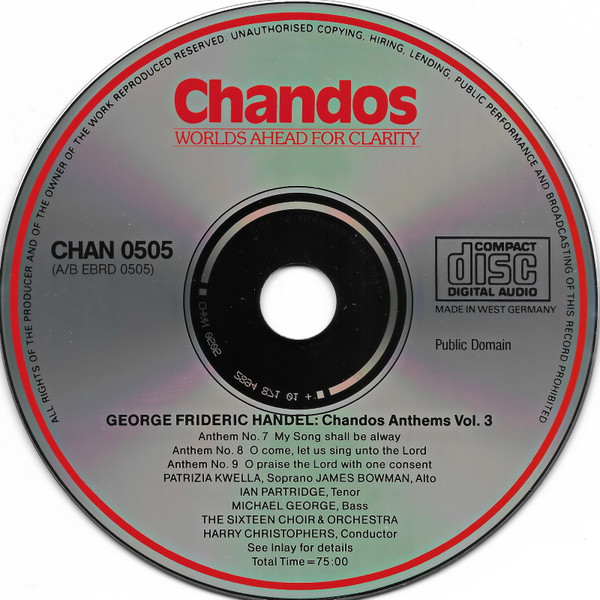 Georg Friedrich Händel The Sixteen Harry Christophers James Bowman (2) Patrizia Kwella Michael George (3) Jan Partridge – Chandos Anthems Volume 3 - Nos. 7, 8 & 9