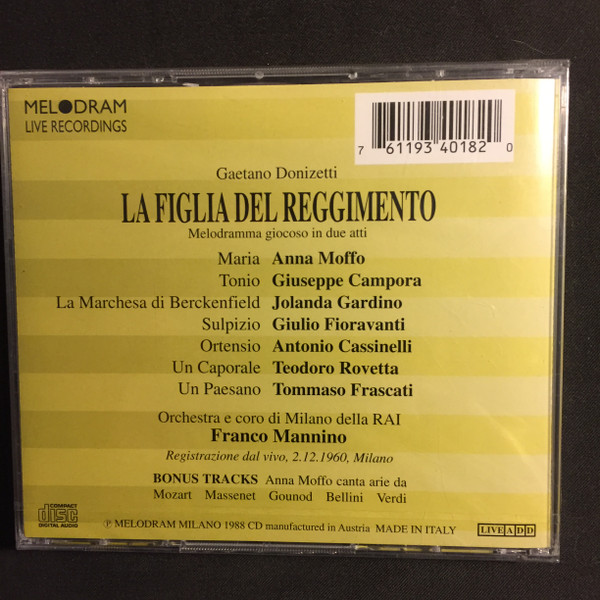 Anna Moffo Gaetano Donizetti Giuseppe Campora Jolanda Gardino Orchestra Sinfonica Di Milano Della RAI Franco Mannino Giulio Fioravanti – La Figlia Del Reggimento