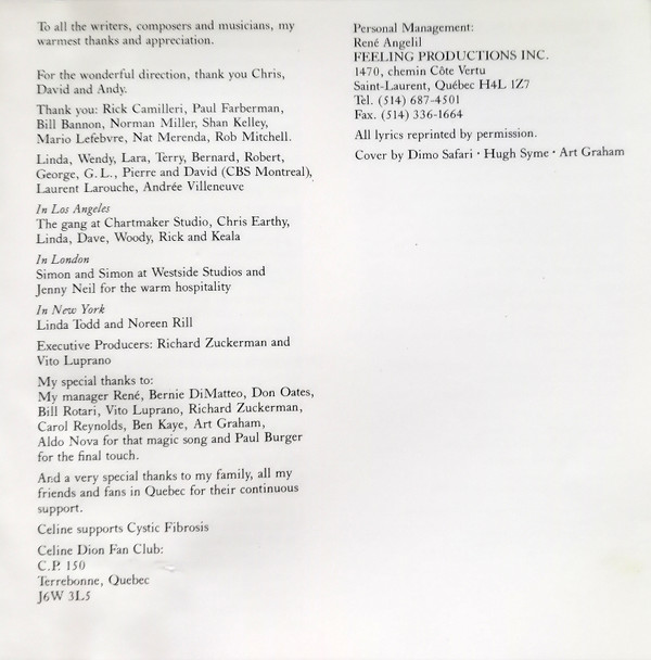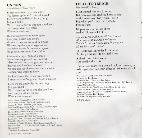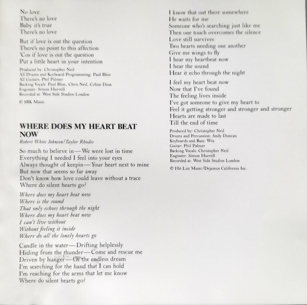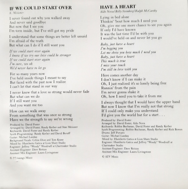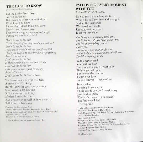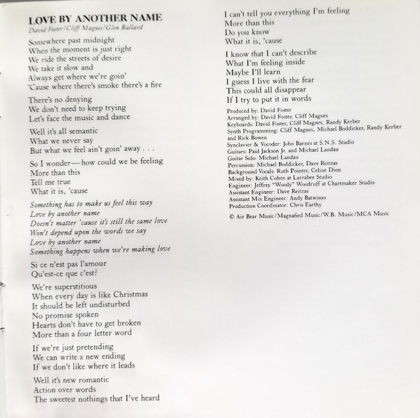 Arranged By – Clif Magness Arranged By – David Foster Backing Vocals – Ruth Pointer Backing Vocals – Céline Dion Guitar – Michael Landau Guitar – Paul Jackson Jr. Keyboards – Clif Magness Keyboards – Randy Kerber Keyboards – David Foster Percussion – David Reitzas Percussion – Michael Boddicker Producer – David Foster Written-By – Clif Magness Written-By – Glen Ballard Written-By – David Foster |