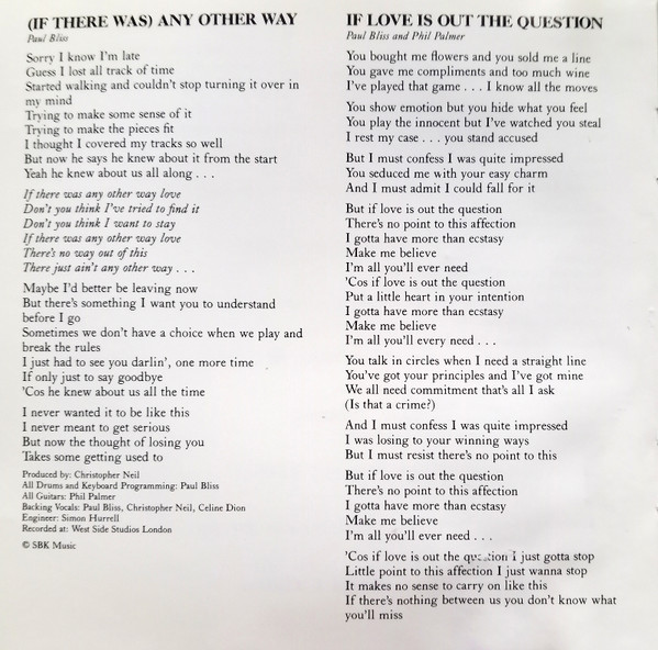 Backing Vocals – Céline Dion Backing Vocals – Christopher Neil Backing Vocals – Paul Bliss Drums – Paul Bliss Guitar – Phil Palmer Keyboards – Paul Bliss Producer – Christopher Neil Written-By – Paul Bliss |