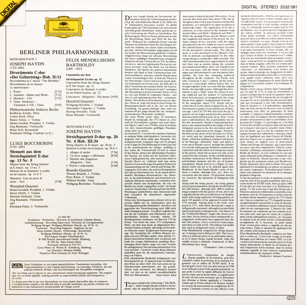Brandis Quartet Westphal-Quartett Philharmonische Solisten Berlin Herzfeld-Quartett – Berliner Philharmoniker Kammermusikvereinigungen - Streichquartett Op. 20 No. 4 • Divertimento "Der Geburtstag" • Menuett • Canzonetta