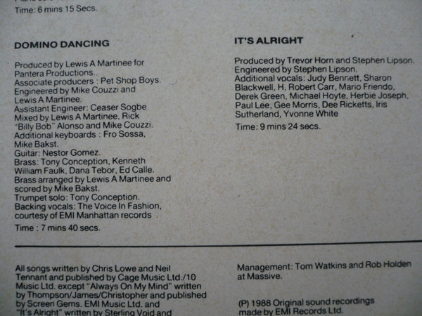 Engineer – Julian Mendelsohn Producer – Julian Mendelsohn Producer – Pet Shop Boys Producer [Produced With Thanks To] – David Jacob Producer [Produced With Thanks To] – Ian Curnow Producer [Produced With Thanks To] – Phil Harding Programmed By [Fairlight Programming] – Andy Richards Programmed By [Fairlight Programming] – Gary Maughan Written-By – Mark James (4) Written-By – Wayne Carson Thompson Written-By – Johnny Christopher |