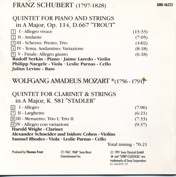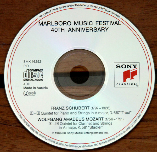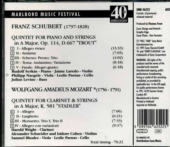 Jaime Laredo – Schubert: "Trout" Quintet - Mozart: "Stadler" Quintet / Marlboro Festival / 40Th Anniversary