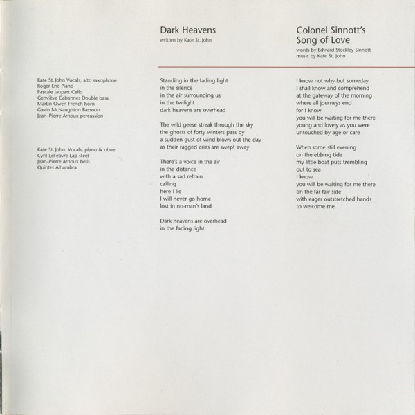 Arranged By – Kate St. John Bassoon – Gavin McNaughton Cello – Pascale Jaupart Double Bass – Geneviève Cabannes French Horn – Martin Owen Percussion – Jean-Pierre Arnoux Piano – Roger Eno Vocals, Alto Saxophone – Kate St. John Written-By – Kate St. John |