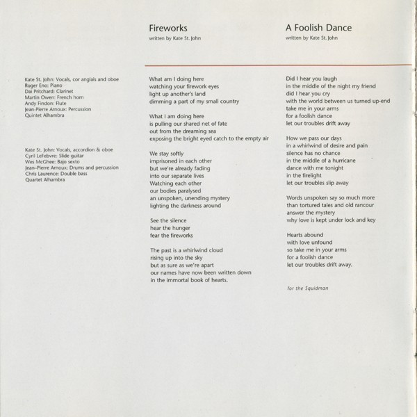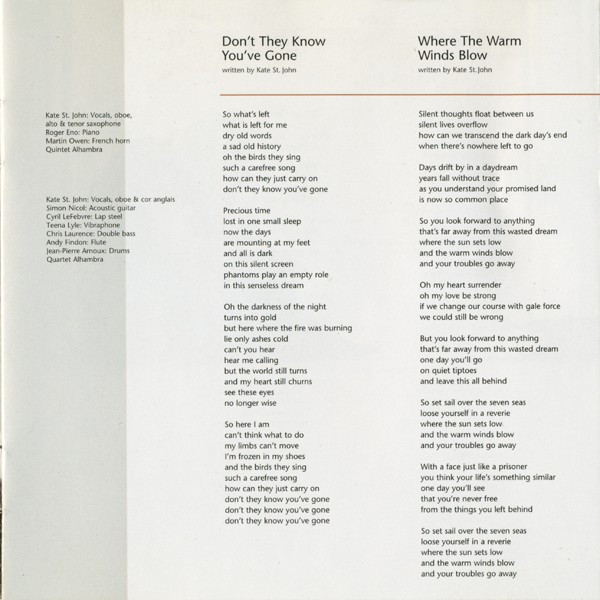 Arranged By – Kate St. John Clarinet – Dai Pritchard Flute – Andrew Findon French Horn – Martin Owen Percussion – Jean-Pierre Arnoux Piano – Roger Eno Strings – Alhambra (2) Vocals, Cor Anglais, Oboe – Kate St. John Written-By – Kate St. John |