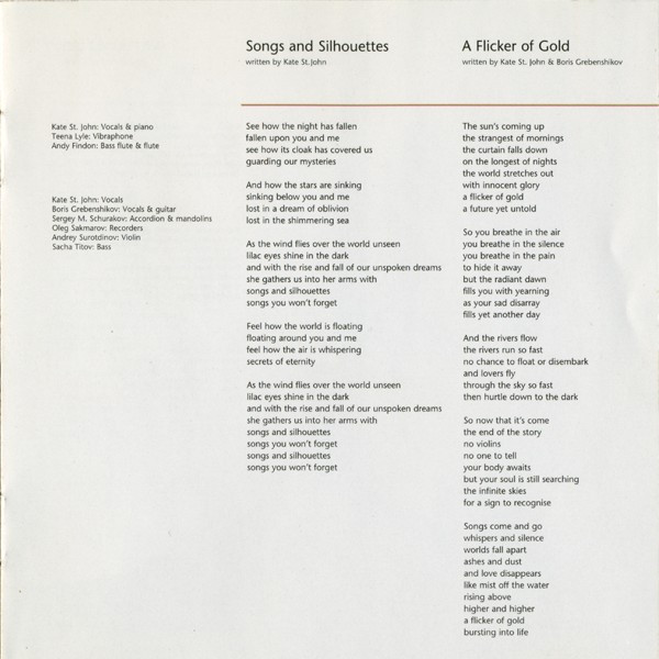 Accordion, Mandolin – Сергей Щураков Arranged By – Joseph Racaille Arranged By – Kate St. John Arranged By – Аквариум Bass – Александр Титов Recorder – Олег Сакмаров Violin – Андрей Суротдинов Vocals – Kate St. John Vocals, Guitar – Борис Гребенщиков Written-By – Kate St. John Written-By – Борис Гребенщиков |