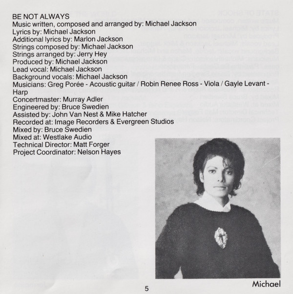 Acoustic Guitar – Greg Poree Arranged By [Strings] – Jerry Hey Backing Vocals – Michael Jackson Composed By [Strings] – Michael Jackson Concertmaster – Murray Adler Coordinator [Project Coordinator] – Nelson Hayes Directed By [Technical Director] – Matt Forger Engineer – Bruce Swedien Engineer [Assistant] – Mike Hatcher Engineer [Assistant] – John Van Nest Harp – Gayle Levant Lead Vocals – Michael Jackson Lyrics By – Michael Jackson Lyrics By [Additional] – Marlon Jackson Mixed By – Bruce Swedien Music By, Composed By, Arranged By – Michael Jackson Producer – Michael Jackson Viola – Robin Ross (2) |