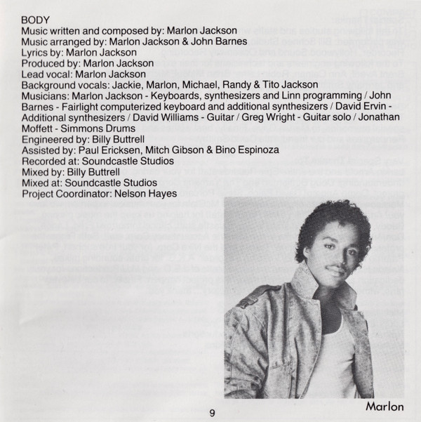 Arranged By – John Barnes Arranged By – Marlon Jackson Backing Vocals – Jackie Jackson Backing Vocals – Michael Jackson Backing Vocals – Randy Jackson Backing Vocals – Marlon Jackson Backing Vocals – Tito Jackson Coordinator [Project Coordinator] – Nelson Hayes Electronic Drums [Simmons Drums] – Jonathan Moffett Engineer – Bill Bottrell Engineer [Assistant] – Bino Espinoza Engineer [Assistant] – Mitch Gibson Engineer [Assistant] – Paul Ericksen Guitar – David Williams (4) Guitar, Soloist – Gregg Wright Keyboards [Fairlight Comuterized Keyboard], Synthesizer [Additional] – John Barnes Keyboards, Synthesizer, Programmed By [Linn Programming] – Marlon Jackson Lead Vocals – Marlon Jackson Lyrics By – Marlon Jackson Mixed By – Bill Bottrell Music By, Composed By – Marlon Jackson Producer – Marlon Jackson Synthesizer [Additional] – David Ervin |