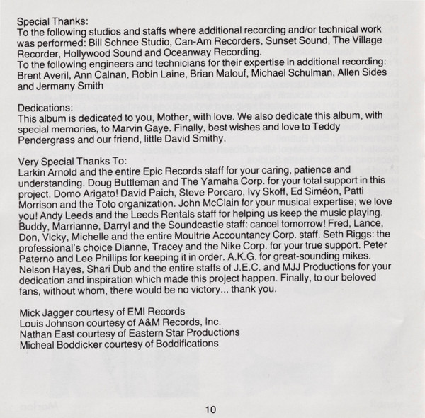 Backing Vocals – Jackie Jackson Backing Vocals – Michael Jackson Backing Vocals – Jermaine Jackson Backing Vocals – Randy Jackson Backing Vocals – Marlon Jackson Backing Vocals – Tito Jackson Coordinator [Project Coordinator For The Jacksons] – Nelson Hayes Coordinator [Project Coordinator For Toto] – Ivy Skoff Engineer – Bill Bottrell Engineer – Tom Knox Engineer [Assistant] – Brian Malouf Engineer [Assistant] – Bino Espinoza Engineer [Assistant] – Ann Calnan Engineer [Assistant] – Paul Ericksen Engineer [Assistant] – Shep Lonsdale Keyboards, Synthesizer – David Paich Keyboards, Synthesizer – Randy Jackson Keyboards, Synthesizer – Steve Porcaro Lead Vocals – Randy Jackson Lyrics By – Michael Jackson Lyrics By – Randy Jackson Mixed By – Bill Bottrell Music By, Composed By, Arranged By – Michael Jackson Music By, Composed By, Arranged By – David Paich Music By, Composed By, Arranged By – Randy Jackson Music By, Composed By, Arranged By – Steve Porcaro Producer – David Paich Producer – Steve Porcaro Producer – The Jacksons |