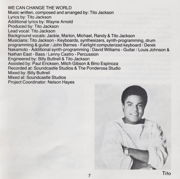 Backing Vocals – Jackie Jackson Backing Vocals – Michael Jackson Backing Vocals – Randy Jackson Backing Vocals – Marlon Jackson Backing Vocals – Tito Jackson Bass – Nathan East Bass – Louis Johnson Coordinator [Project Coordinator] – Nelson Hayes Engineer – Bill Bottrell Engineer – Tito Jackson Engineer [Assistant] – Bino Espinoza Engineer [Assistant] – Mitch Gibson Engineer [Assistant] – Paul Ericksen Guitar – David Williams (4) Keyboards [Fairlight Computerized Keyboard] – John Barnes Keyboards, Synthesizer, Programmed By [Synth-Programming], Drum Programming, Guitar – Tito Jackson Lead Vocals – Tito Jackson Lyrics By – Tito Jackson Lyrics By [Additional] – Wayne Arnold Mixed By – Bill Bottrell Music By, Composed By, Arranged By – Tito Jackson Percussion – Lenny Castro Producer – Tito Jackson Programmed By [Additional Synth-Programming] – Derek Nakamoto |