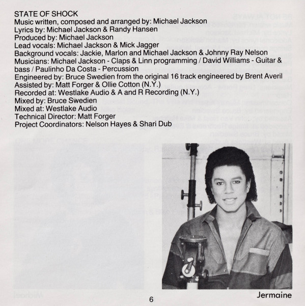 Backing Vocals – Jackie Jackson Backing Vocals – Michael Jackson Backing Vocals – Marlon Jackson Backing Vocals – Johnny Ray Nelson Coordinator [Project Coordinator] – Shari Dub Coordinator [Project Coordinator] – Nelson Hayes Directed By [Technical Director] – Matt Forger Engineer – Brent Averill Engineer – Bruce Swedien Engineer [Assistant, N.Y.] – Ollie Cotton Engineer [Assistant] – Matt Forger Guitar, Bass – David Williams (4) Lead Vocals – Michael Jackson Lead Vocals – Mick Jagger Lyrics By – Michael Jackson Lyrics By – Randy Hansen Mixed By – Bruce Swedien Music By, Composed By, Arranged By – Michael Jackson Percussion – Paulinho Da Costa Producer – Michael Jackson Programmed By [Claps & Linn Programming] – Michael Jackson |
